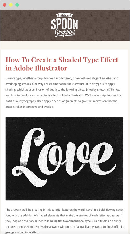 I post new content on Spoon Graphics each week comprising of tutorials, downloads and articles. Every time a new post is published I’ll send a notification email with a brief overview of the topic. Alongside these weekly emails you’ll also receive periodic updates letting you know about cool deals, new members-only content and general site news. I aim to keep the frequency at around 3 emails per week, but if I have lots of awesome stuff I want to share expect up to 4 on the odd occasion.